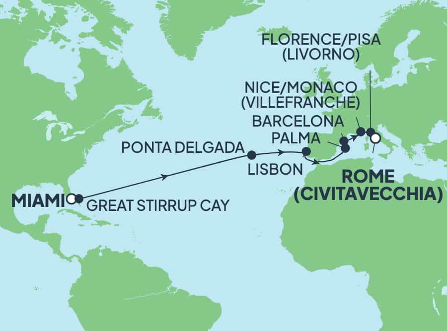 Embárcate en una inolvidable travesía transatlántica que comienza con un día de emociones tropicales en Great Stirrup Cay, la isla privada recientemente renovada de Norwegian. Luego, abandona el Nuevo Mundo -y sus antiguas preocupaciones- y zarpa hacia el otro lado del Atlántico. Lleva tu paladar a un viaje en los numerosos restaurantes de especialidades a bordo del Norwegian Sun®, disfruta de una sesión de ejercicio con vistas panorámicas en el gimnasio y llega a Portugal listo para experimentar más de todo lo que Europa tiene para ofrecer. Visita un pintoresco pueblo dentro de un cráter volcánico en Ponta Delgada. Descubre una de las ciudades más modernas de Europa y la atrevida arquitectura de Gaudí en Barcelona. Disfruta de los animados cafés, bares y el encanto mediterráneo del puerto de Livorno. O haz una excursión de un día bajo el sol de la Toscana para ver la Torre de Pisa y la Piazza del Duomo en Florencia.