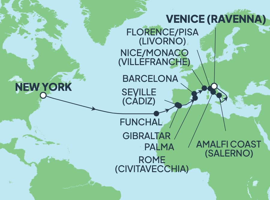 Explora vistas imponentes en tu crucero transatlántico de 19 días a bordo del Norwegian Gem®. Disfruta del rico vino local elaborado en Madeira y admira las vistas desde los florecientes jardines botánicos. Contempla cara a cara las vistas al mar que se extienden a lo largo de dos continentes y disfruta de la historia británica y morisca en Gibraltar. Viaja al pasado y explora los antiguos baños romanos en Civitavecchia, la puerta histórica a Roma.