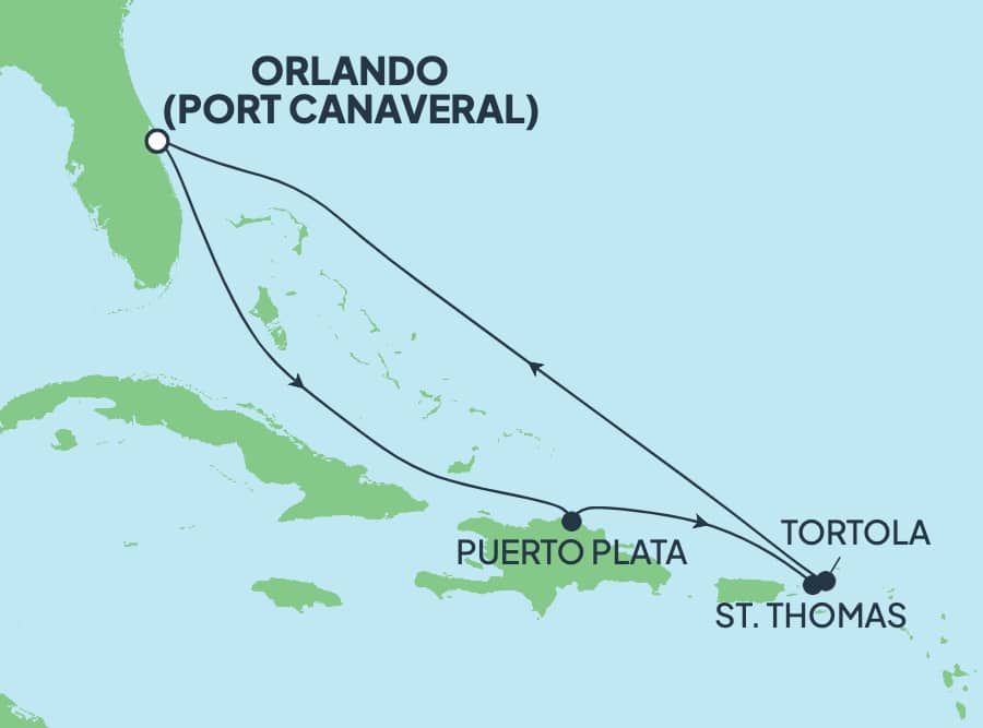 Tu paraíso tropical está cerca a bordo de este crucero de ida y vuelta desde Puerto Cañaveral. Vuela alto sobre el suelo de la selva en una tirolesa emocionante, luego disfruta de una fresca zambullida en las piscinas debajo de las impresionantes cascadas Damajagua en Puerto Plata. En Santo Tomás, saluda a las tortugas verdes y los peces de colores mientras haces esnórquel en las aguas turquesas de Turtle Cove. Súbete al Jeep y haz un recorrido todoterreno hasta una de las playas más exclusivas de Tortola, Smuggler's Cove.