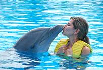 Upon arrival at Sanctuary Bay, one of the most natural and largest protected dolphin facilities in the world, you will begin your dolphin encounter. Learn about these amazing creatures as our professional dolphin trainers conduct an educational orientation. Interact with these friendly dolphins while they splash and jump around you, and then step on to a 3 foot deep submerged platform where you will touch, kiss and hug a dolphin.