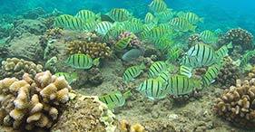 Cruise in an open-air Zodiac along the spectacularly scenic Pali sea cliffs and snorkel the lengthy coral reef that lies just offshore. You will zip through the water on the Reef Explorer, a 60-foot custom super-raft with shaded and open-deck seating. Before long, you will arrive at the precipitous heavily vegetated sea cliffs, which will serve as a magnificent backdrop for the snorkeling adventure. Plenty of other natural wonders lie beneath the water’s surface. While there is no telling what you will observe along the reef, it will surely be extraordinary. Red-lip parrotfish, slender needlefish, orange-band surgeonfish and bluefin jacks all inhabit these crystal-clear waters. You may even see white-spotted eagle rays and green sea turtles, the most commonly seen sea turtle in Hawaii. The coral formations are just as eye-catching. Some are named for their odd shapes such as the mushroom, cauliflower and antler corals.