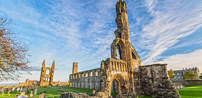 On arrival into St. Andrews, you'll make a brief photo stop at the atmospheric ruins of St. Andrews Cathedral, which are among the most photographed in Scotland. The great east window and surviving foundations give an impression of the size and splendor of the edifice. The cathedral was founded in 1160 by Arnold, Abbot of Kelso, but the turbulence of medieval Scotland delayed its completion until 1318. It grew to become the longest and greatest church in the land, unequalled anywhere else.