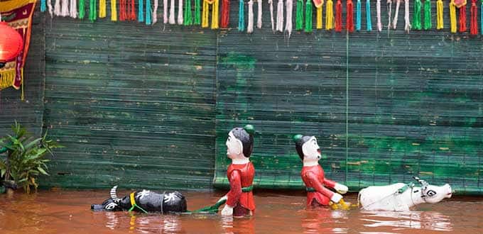 The puppets range from 12 to 40 inches in height and from two to ten pounds. Many of the puppets are so heavy and complex that they require two or three puppeteers. During the performance, the puppeteers hide themselves behind a long screen and manipulate the wooden puppets with bamboo rods and strings while standing chest-deep in water. The show depicts Vietnamese life like weddings, domestic animals and school examinations accompanies by the music of bamboo flutes, drums, bells and single-string violins.