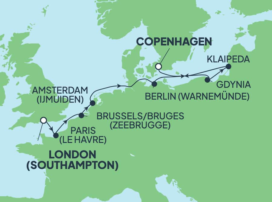 Embarque no Norwegian Jewel® em uma incrível viagem de 9 dias de Southampton para Copenhague com a Norwegian. Em Warnemünde, Alemanha, caminhe pela encantadora cidade costeira ou faça uma viagem de um dia para Berlim para visitar pontos turísticos icônicos, como o Portão de Brandemburgo. Em Klaipeda, Lituânia, participe de uma aula prática de culinária para preparar um prato tradicional, saboreie uma sopa de beterrabas rosadas e experimente cervejas locais após um passeio pela histórica Cervejaria Svyturys. Depois, apaixone-se por Copenhague enquanto passeia por suas ruas pitorescas até o Castelo de Rosenborg, construído no século 17 e que já foi a residência de verão de reis, e veja as joias da coroa e o Salão dos Cavaleiros enquanto visita o local.