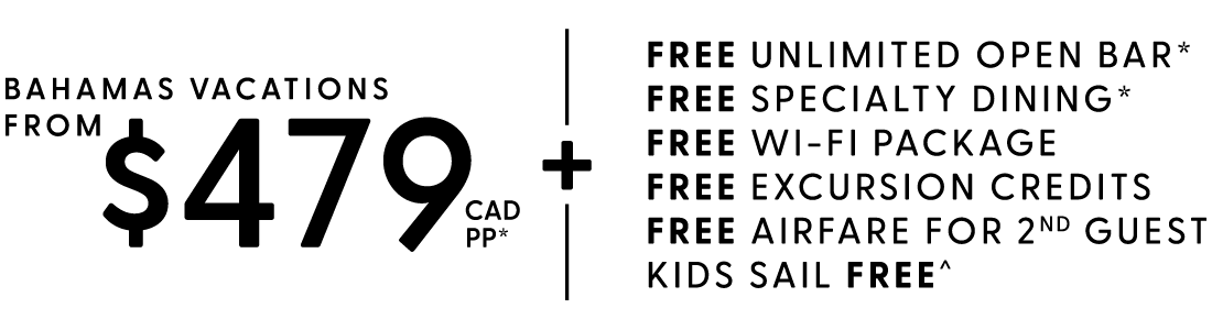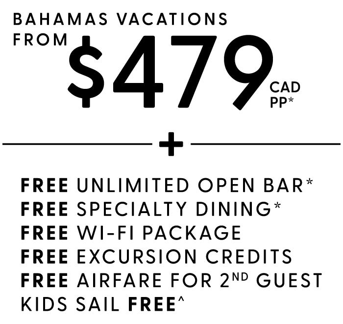 • Additional cost added to booking for optional package selections Unlimited Open Bar and Specialty Dining. Free 3rd & 4th Guests on select cruises. Restrictions apply.