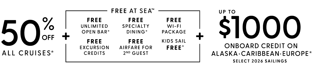 Planning the perfect cruise vacation shouldn't break the bank - here you’ll find our latest promotions + details on Norwegian’s Free at Sea™. - the best value at sea! Enjoy Unlimited Open Bar, Specialty Dining, Excursion Credits, Wi-Fi Package, Free Airfare^ and more.