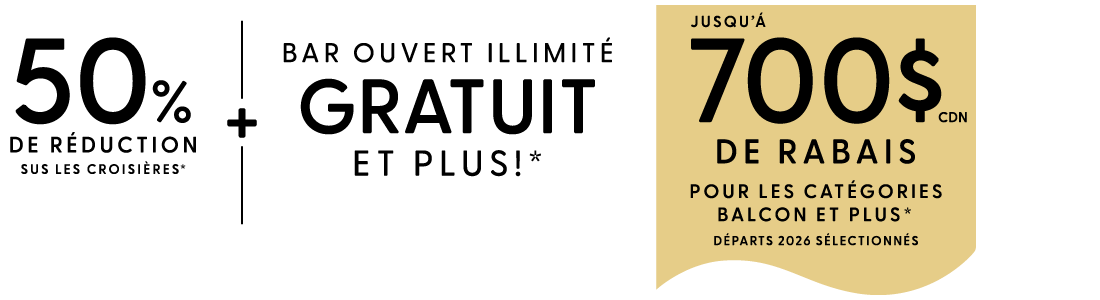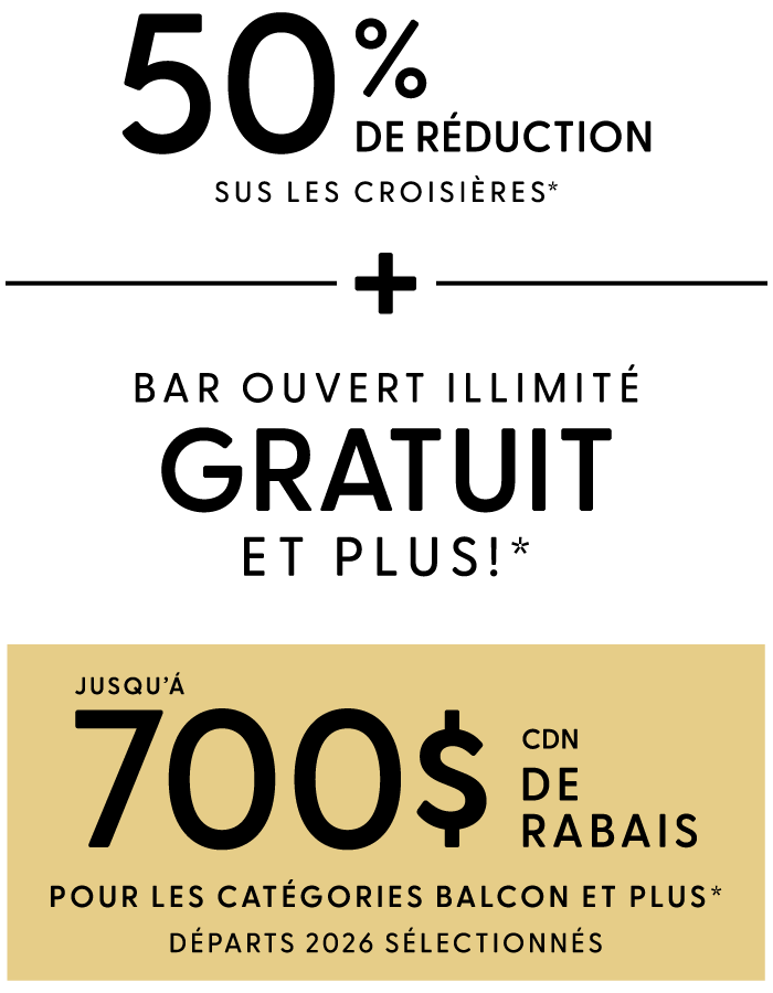 Réservez vos vacances de 7 jours ou plus dès aujourd'hui avec un dépôt réduit par personne. Valable uniquement lorsque vous réservez une suite Club avec balcon une cabine avec balcon ou une cabine de catégorie inférieure.