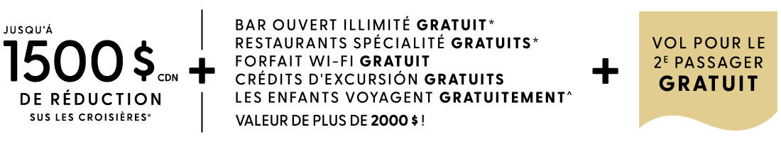 Planifier des vacances de croisière parfaites ne devrait pas vous ruiner - vous trouverez ici nos dernières promotions + des détails sur Free at Sea™ de Norwegian - le meilleur rapport qualité-prix en mer! Profitez du bar libre illimité, des restaurants de spécialités, des crédits d'excursion, du forfait Wi-Fi, des billets d'avion gratuits^ et bien plus encore.