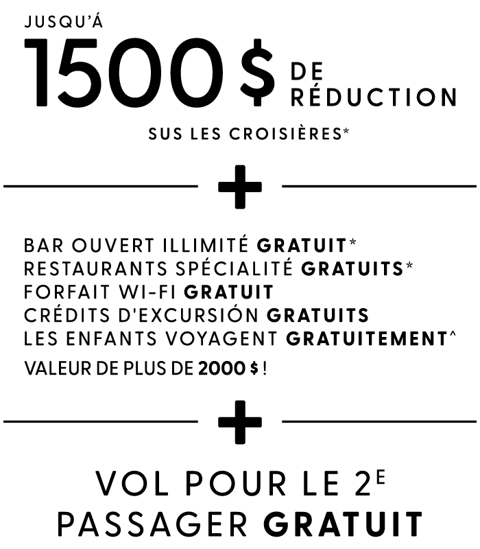 Des crédits de croisière aux dépôts réduits en passant par les réductions pour les passagers supplémentaires, c'est ici que vous trouverez tous les moyens de profiter au maximum de votre argent sur NCL. Et ne manquz pas nos nouvelles cabines pour passagers en solo. Les tarifs traditionnels d'occupation double ne s'appliquent pas. Ne manquez pas nos offre de croisières exclusives pour les personnes qui voyagent seules.