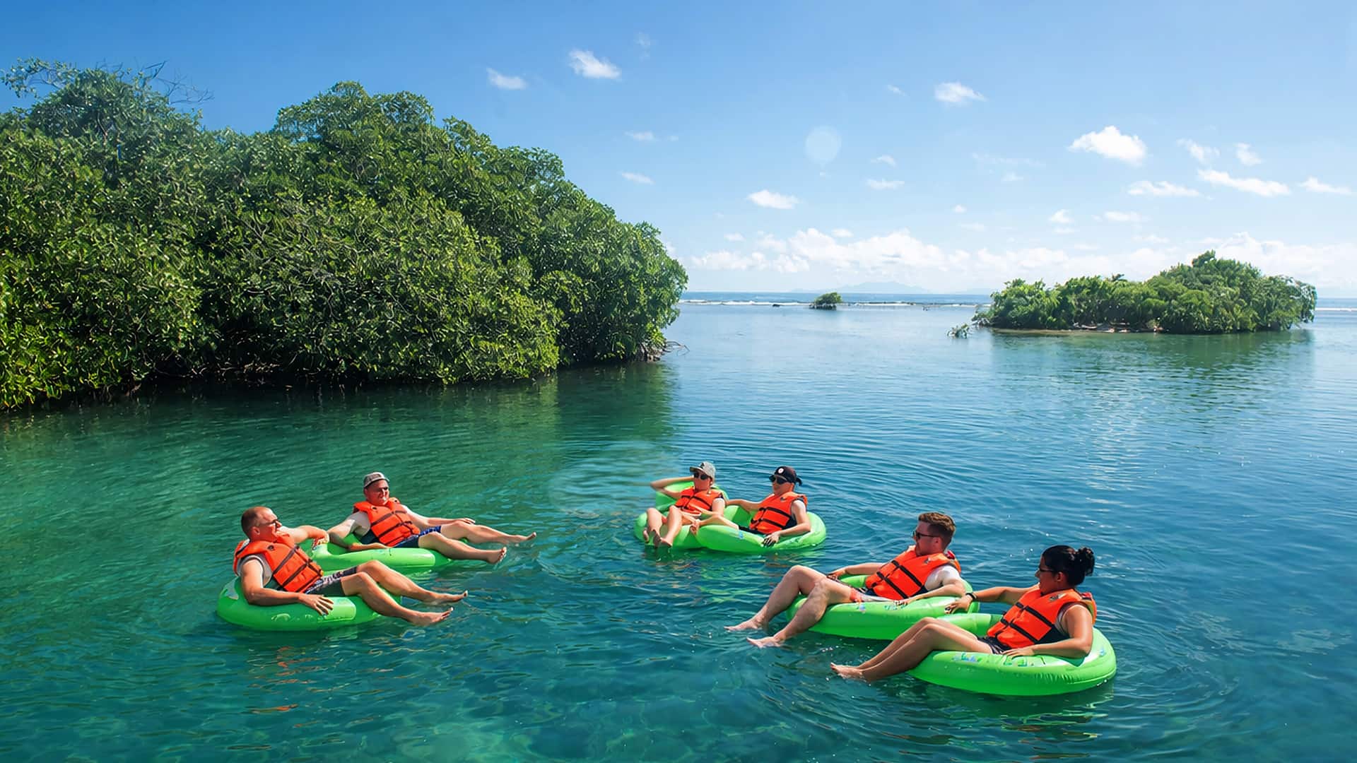 • Float down a sheltered sea canal lined with eco-friendly mangroves.