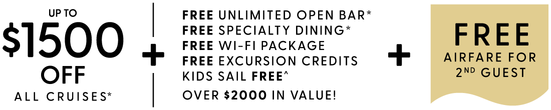 Pay airfare for one guest, and you'll automatically lock-in roundtrip flights for two. Secure these savings online by choosing your nearest airport in step one of your cruise booking, and enjoy air-to-sea made easy. We'll coordinate your roundtrip flights, and transportation between the airport and cruise port.