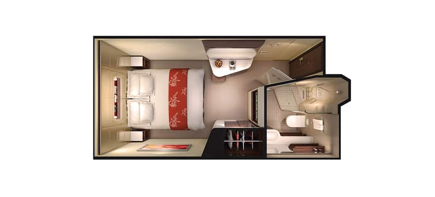 These staterooms include two lower beds that convert to a queen-size bed. Door opens to center interior corridor.