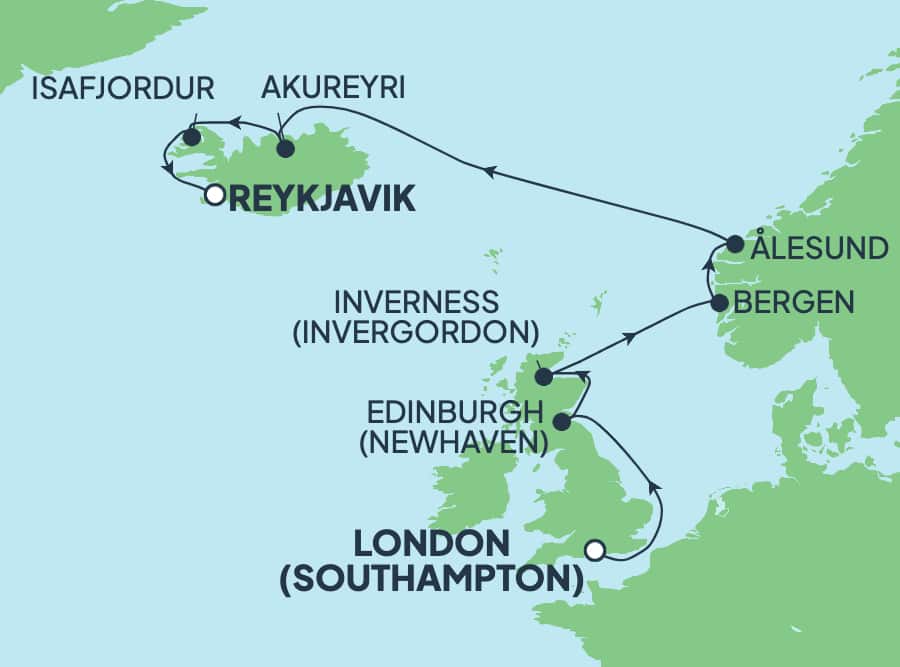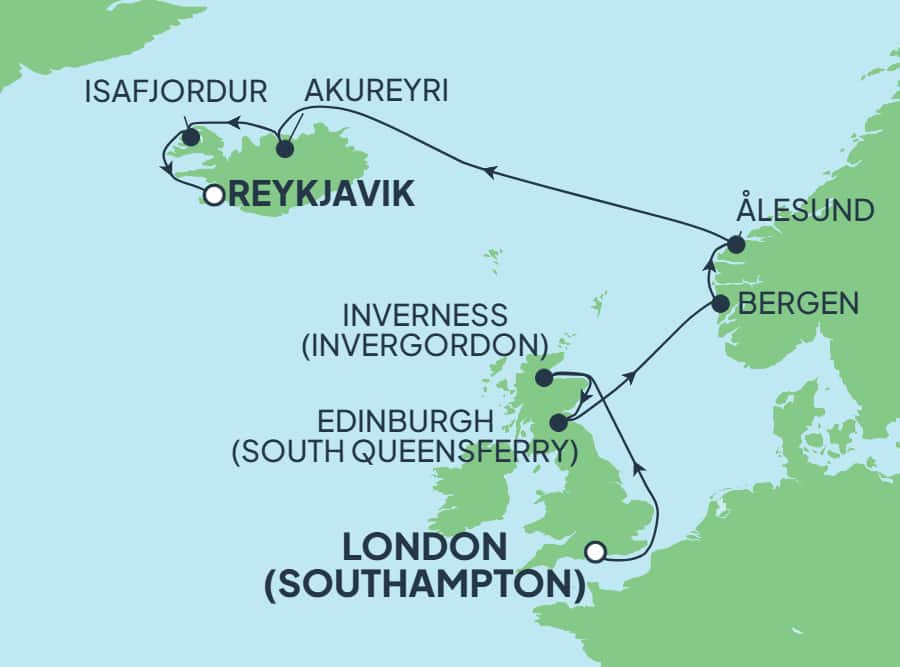 Set sail from Southampton on an 11-day adventure toward the land of fire and ice—Reykjavik. Discover rugged coastlines, quaint villages, and the raw beauty of the Atlantic, culminating in the awe-inspiring wonders of Iceland. Start in Newhaven with a scenic tour of Edinburgh’s historic castles and cobblestone streets. Hunt for Nessie in Invergordon or explore the ancient ruins of Urquhart Castle. Sail to Ålesund, where you can hike to the top of Mount Aksla for breathtaking views of the Art Nouveau town and surrounding fjords. Finally, travel by boat from Isafjordur to the remote, picturesque village of Hesteyri, deserted over 60 years ago, where time stands still amidst snow-dusted mountains and secluded coves.