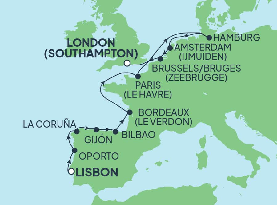 Sail happily ever after on a ‘storybook’ 14-day European adventure, journeying from the sun-soaked streets of Lisbon to the historic harbor of Southampton. In La Coruña, explore the ancient Tower of Hercules, the world’s oldest working lighthouse, followed by a leisurely stroll through the charming Old Town. In Le Verdon, visit a prestigious chateau in the Médoc region, where you’ll discover the art of winemaking from grape to glass. Zeebrugge offers medieval allure with its picturesque canals and historic squares. Finally, enjoy an overnight stay in Hamburg, where you can enjoy the lively Reeperbahn district or a serene cruise on the Alster River, soaking in the city’s vibrant atmosphere.