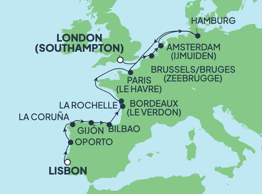 Sail happily ever after on a ‘storybook’ 14-day European adventure, journeying from the sun-soaked streets of Lisbon to the historic harbor of Southampton. In La Coruña, explore the ancient Tower of Hercules, the world’s oldest working lighthouse, followed by a leisurely stroll through the charming Old Town. In Le Verdon, visit a prestigious chateau in the Médoc region, where you’ll discover the art of winemaking from grape to glass. Zeebrugge offers medieval allure with its picturesque canals and historic squares. Finally, enjoy an overnight stay in Hamburg, where you can enjoy the lively Reeperbahn district or a serene cruise on the Alster River, soaking in the city’s vibrant atmosphere.