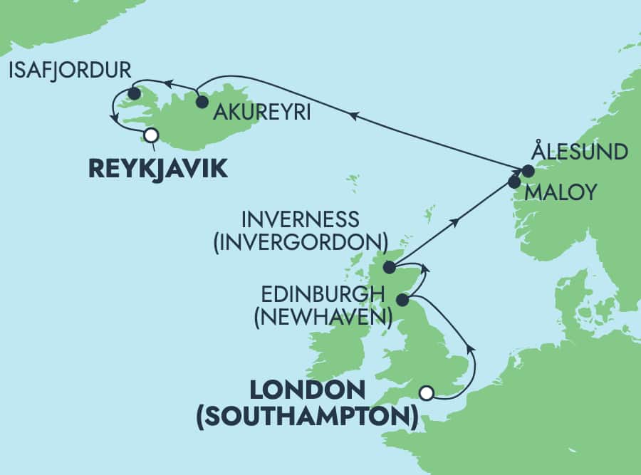 Set sail from Southampton on an 11-day adventure toward the land of fire and ice—Reykjavik. Discover rugged coastlines, quaint villages, and the raw beauty of the Atlantic, culminating in the awe-inspiring wonders of Iceland. Start in Newhaven with a scenic tour of Edinburgh’s historic castles and cobblestone streets. Hunt for Nessie in Invergordon or explore the ancient ruins of Urquhart Castle. Sail to Ålesund, where you can hike to the top of Mount Aksla for breathtaking views of the Art Nouveau town and surrounding fjords. Finally, travel by boat from Isafjordur to the remote, picturesque village of Hesteyri, deserted over 60 years ago, where time stands still amidst snow-dusted mountains and secluded coves.