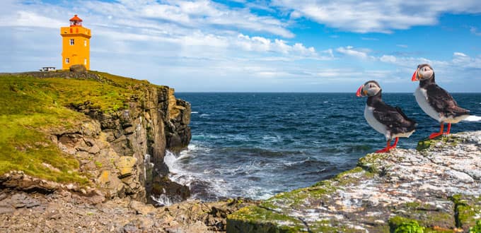 • See the island’s signature lighthouse, a church built from driftwood and raucous colonies of puffins and other seabirds making a home along the cliffs.