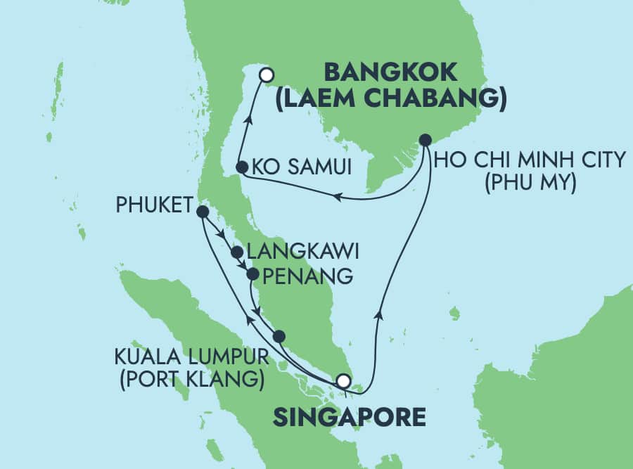 Be immersed in the rich cultures and traditions and spectacular landscapes of Southeast Asia. In Phuket, visit historic Buddhist temples, recline on some of Thailand's most popular beaches and dive into a vibrant underwater world on a snorkelling tour. In Port Klang, you can get a bird's eye view of Malaysia's capital from the observation deck of Kuala Lumpur Tower and experience why Kuala Lampur is called the Garden City on a tour of its colourful gardens and parks. During your overnight stay in Ho Chi Minh City (Phu My), explore an underground labyrinth on a tour of the Cu Chi Tunnels or stay above ground to take in the highlights of the bustling city. With plenty of time to explore during your overnight stay in Laem Chabang, you can travel to Bangkok to tour the Grand Palace and Temple of the Emerald Buddha and visit the colourful Pattaya Floating Market.