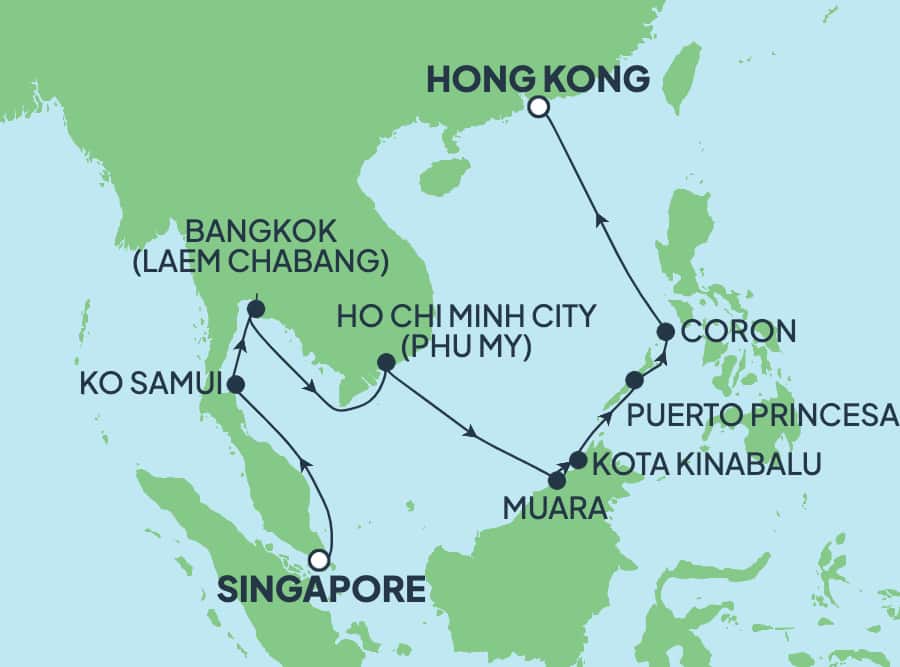 Set sail on a 13-day to remember from Singapore to Hong Kong with Norwegian. From Laem Chabang, witness Bangkok's glorious golden temples and palaces, the royal barges and the Temple of the Emerald Buddha. Wander the bustling, ethnically diverse city of Kota Kinabalu in Malaysia with its unique high-rise architecture. Or venture into the interior to discover exotic plants and rare orchids. And enjoy history, nature, good food and relaxing beaches in Puerto Princesa, Philippines.