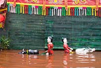 The puppets range from 12 to 40 inches in height and from two to ten pounds. Many of the puppets are so heavy and complex that they require two or three puppeteers. During the performance, the puppeteers hide themselves behind a long screen and manipulate the wooden puppets with bamboo rods and strings while standing chest-deep in water. The show depicts Vietnamese life like weddings, domestic animals and school examinations accompanies by the music of bamboo flutes, drums, bells and single-string violins.