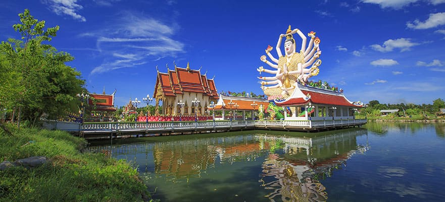Even though you can visit more than 31,000 other temples in Thailand, here's another one we highly recommend visiting. Located along the Chao Phraya River, this spectacular Buddhist temple is dedicated to the God of Dawn. Wat Arun's striking, ornate tower reaches 260 feet high into the air, but as a hint, it's even more striking at night when the entire complex is completely illuminated with a seemingly golden hue.