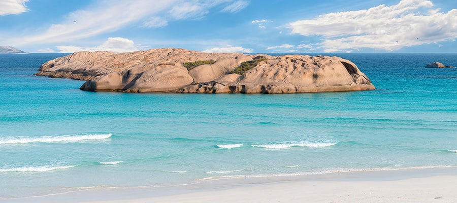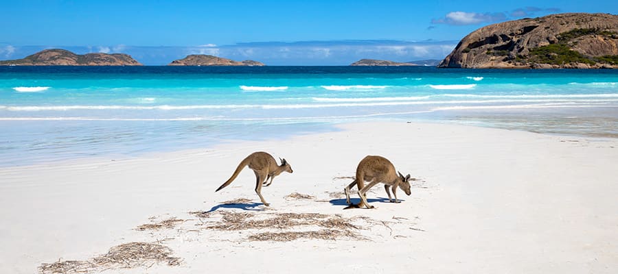 A key attraction is the striking white-sand bay where kangaroos roam freely at edge of turquoise sea—especially Lucky Bay in the Cape Le Grand National Park.