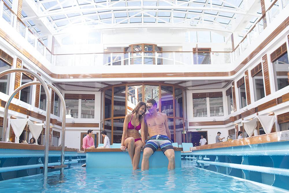 Guests who are booked into Haven accommodations enjoy additional perks beyond those already mentioned! On the Jewel, Jade, Pearl or Gem the private Haven Courtyard features a private pool, hot tub, dining tables, padded loungers surrounding the pool, and a retractable roof. Upstairs is an outdoor sundeck with padded loungers and clamshell seating.