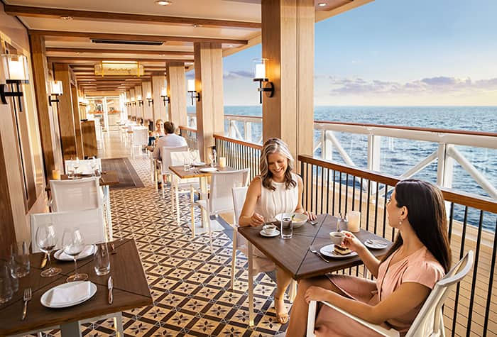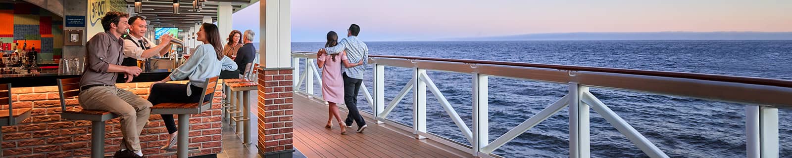 Our newest ships all feature stunning outdoor promenades with waterfront dining, bars and lounges and endless views. These seaside decks are ideal for a morning stroll, a sunset happy hour, or an oceanfront meal.